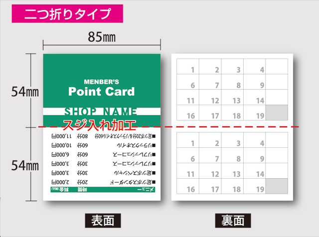 ポイントカード(スタンプカード)の仕様は、カードタイプ と二つ折りタイプ の2種類をご用意しています。