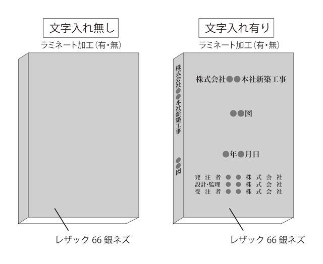 表紙や背表紙に、箔押し(通常は金色の箔)で工事件名、図面名等の文字を入れる装飾的な仕上げです。