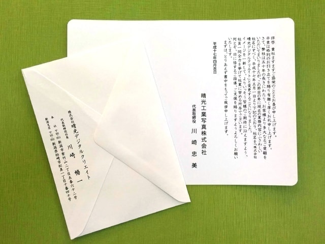 会社設立の挨拶状には定番の洋封筒と二つ折カードのセットが最適です。